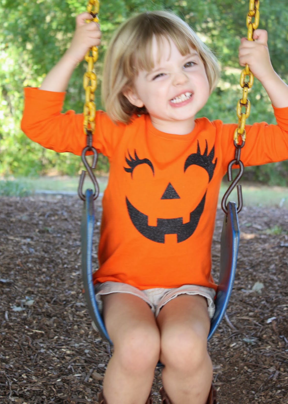 ...while the girls also played on the wooden playset beside it (because OH MY GOSH! They NEVER get to play on a playground Mama! Like EVER!!!!) & we waited to catch up with our friends. I told them to make scary pumpkin faces. You see how that turned out.