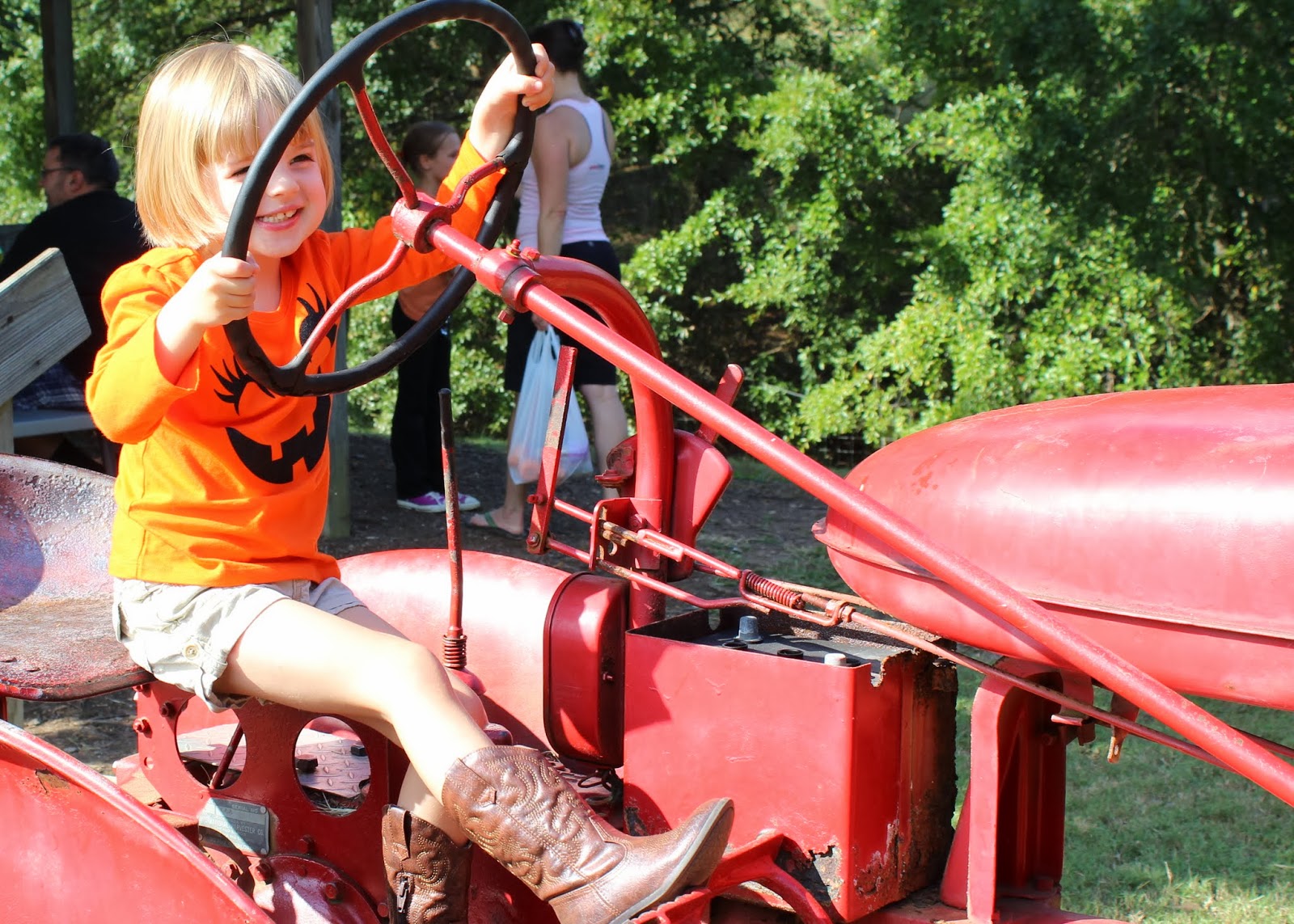 Over the weekend some friends invited us to pick pumpkins with them at Berry Patch Farms. We hadn't gone to a real pumpkin patch since pumpkin-pa-looza in Salt Lake City so we were all in. This time Michael even got to go with us, so all the better. When we first arrived there was this (obvious photo opportunity) cute, vintage, red tractor to climb on & pretend to drive like a pumpkin farmer...