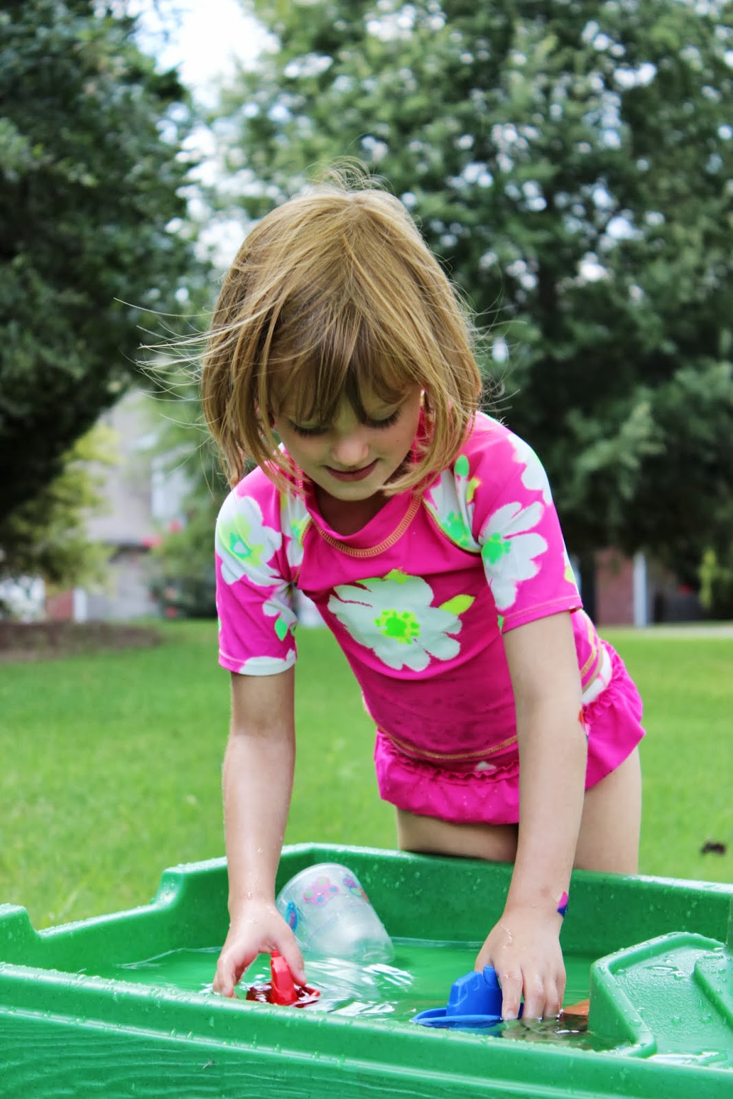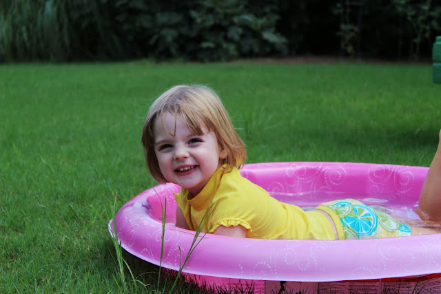 It's nearly the end of summer and we still haven't gone camping. In all honesty the thought of my three kids sleeping in a tent together seems both terrifying & hilarious. And reeks of "little to no sleep for mommy" quite a bit. So we compromised recently and set up a "tent" (a.k.a. sunshade we bought for the beach), dragged out the water table, some bubbles, snacks, lawn chairs & the little pool. Then we got down to the business of relaxing.
